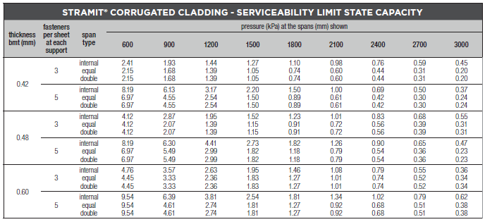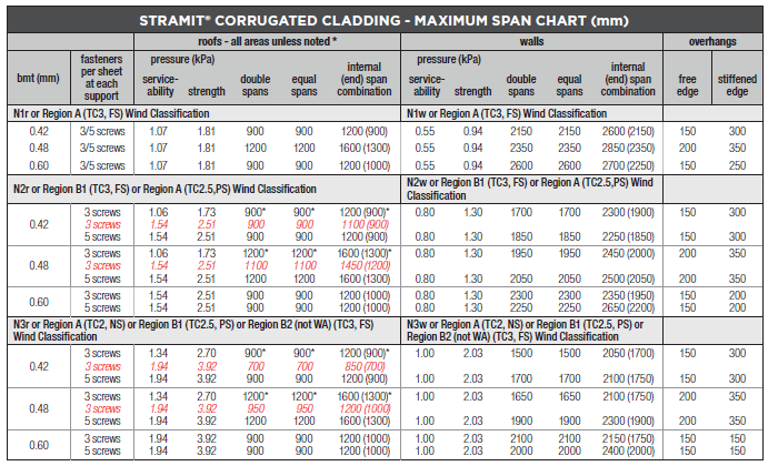 The spans shown below take account of 'normal' foot traffic and wind resistance including local pressure zone effects. Pressures are based on AS 4055:2021 or AS/NZS 1170.2:2021.