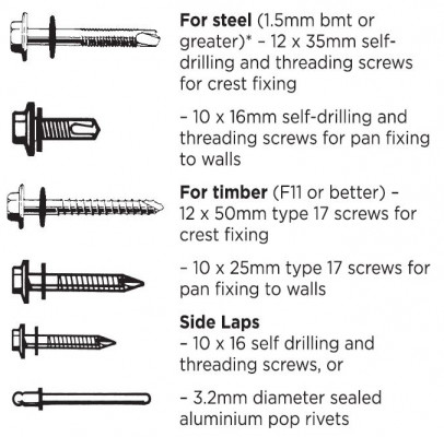 All fastening screws must conform to AS3566 – suitable for minimum corrosivity category 3. They are to be hexagon headed and must be used with sealing washers for both roofing and walling.