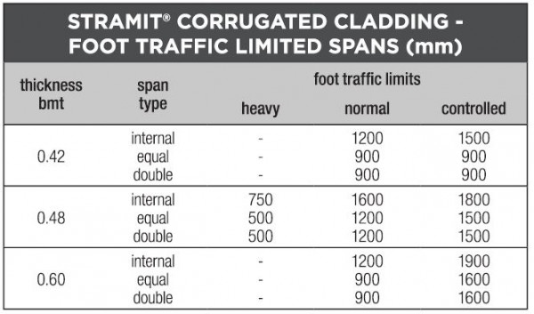 For more specific applications Stramit® Corrugated cladding must be designed to the pressure and foot traffic limits indicated.