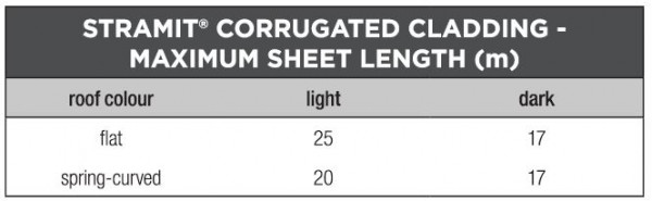 Stramit® Corrugated Roof and Wall Cladding is supplied cut to length. When designing or transporting long products ensure that the length is within the limit of the local Transport Authority regulations.