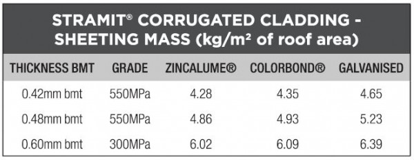 The roofing/walling shall be 0.42 (or 0.48) mm BMT Stramit® Corrugated Roof and Wall Cladding in continuous lengths with sinusoidal ribs 16mm high, spaced at 76.2mm centres in accordance with AS1445. Sheeting material shall be protected steel sheet to Australian Standard AS1397, with a minimum yield stress of 550MPa (Grade G550) and an AM100/AZ150 coating with an oven-baked paint film of selected colour, or a plain AM125/AZ150 coating.