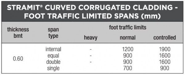 For more specific applications Stramit® Curved Corrugated cladding must be designed to the pressure and foot traffic limitations below.