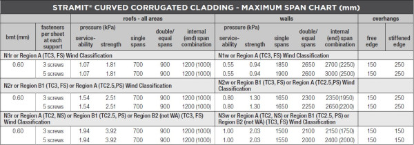 The spans shown below take account of 'normal' foot traffic and wind resistance including local pressure zone effects. Pressures are based on AS 4055:2021 or AS/NZS 1170.2:2021.