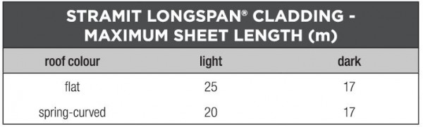The colour of the sheeting will affect the amount of thermal expansion, and whether the sheet is flat or curved will affect its ability to resist without problems. Sheet lengths should be limited as follows.