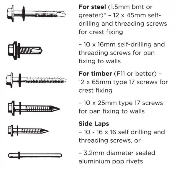 All fastening screws must conform to AS3566 - Class 3. They are to be hexagon headed and for roofing must be used with sealing washers.
