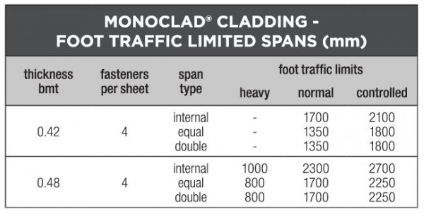 Foot traffic limits for Stramit Monoclad® Roof and Wall Cladding are shown for 3 alternative foot traffic categories: