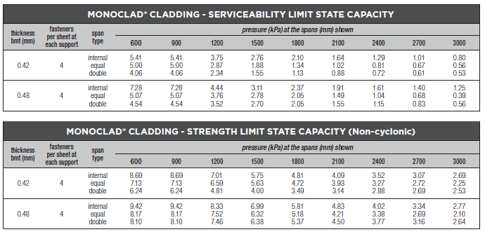 The spans shown below take account of 'normal' foot traffic and wind resistance including local pressure zone effects. Pressures are based on AS 4055:2021 or AS/NZS 1170.2:2021.