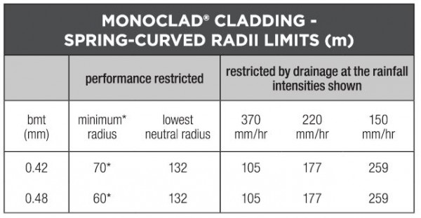 Stramit Monoclad® Roof and Wall Cladding can be spring-curved, concave or convex, including curved ridges, provided it is sealed at the apex, and within the recommended limits below.