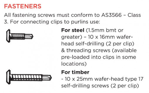 • Ensure all purlins are in line and correctly installed. Using a string line or the edge of the first  sheet, align the first row of fixing clips taking care that the clips are aligned with the arrows in the direction  of laying. Screw the clips to the purlins.