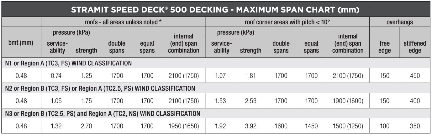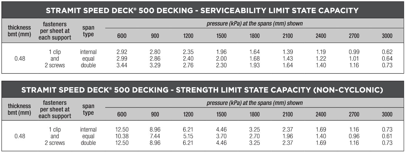 Particular attention is drawn to maintaining an adequate roof slope for snow shedding, and screw fixing of deck pans beneath the ridge capping. Downward load capacities for Stramit Speed Deck® 500 Concealed Fixed Decking have not been tabulated, but can be assumed to equal the outward capacities shown.